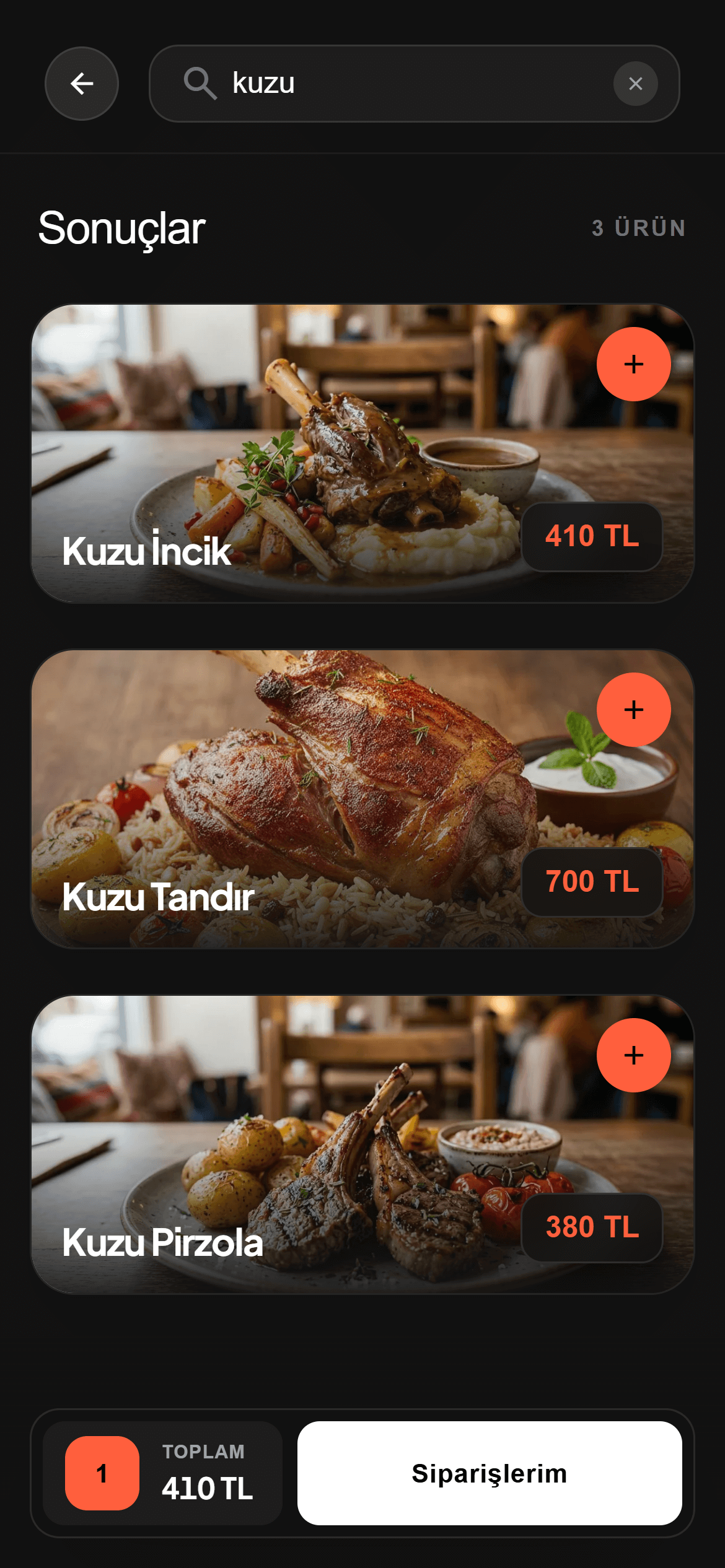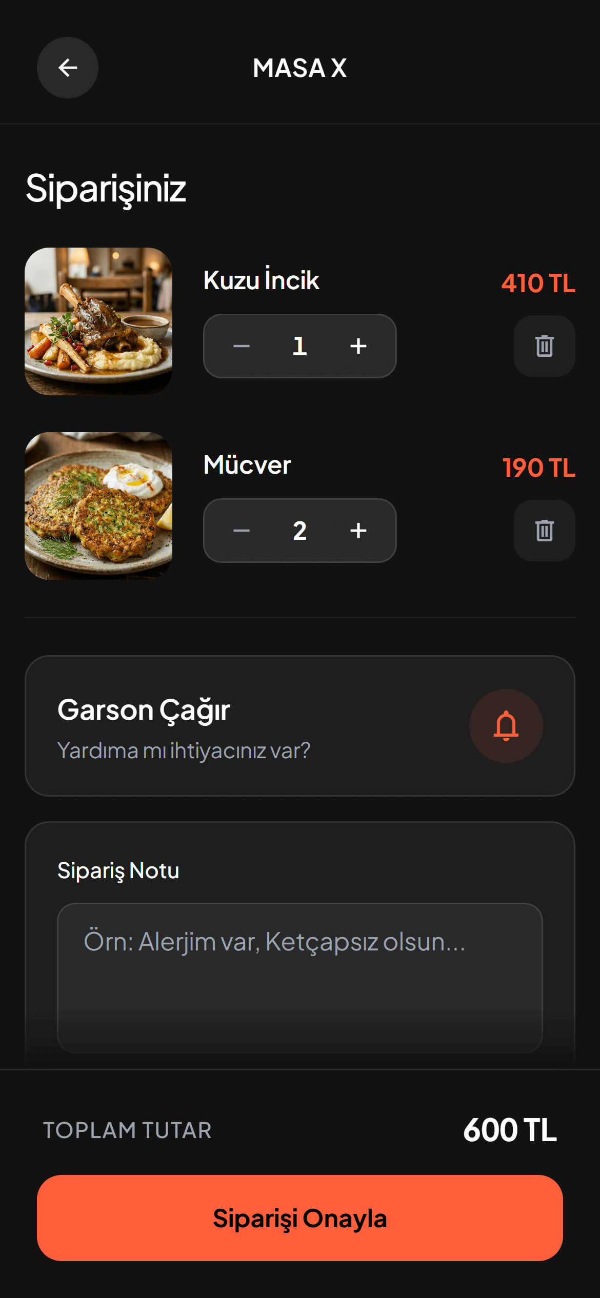Beğenilen ürünleri sepete ekleyip tek tıkla garsona veya mutfağa gönderin.