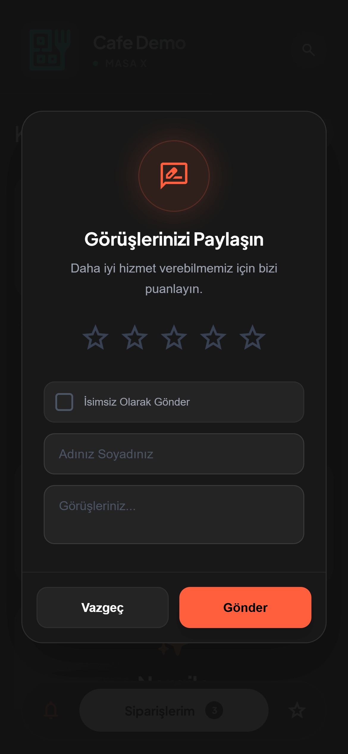 Müşterileriniz hizmetinizi ve yemeklerinizi anında puanlasın, size gizli geri bildirim bıraksın.